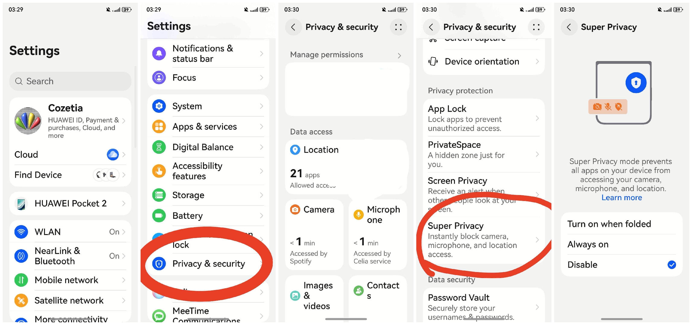 Note: Huawei does offer additional privacy features beyond Super Privacy Mode, like detailed info showing which applications accessed your microphone or camera and at what specific times, however this guide focuses specifically on the Super Privacy Mode feature.
